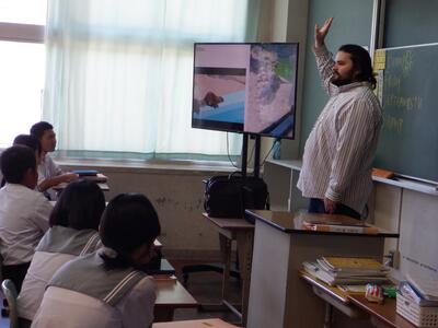 今回の訪問では、自己紹介や出身国アメリカの紹介等を主にしていただきました。生きた英語を学ぶ上で、ネイティブ(母国語話者)の発音に慣れ親しんだり、会話のやりとりを楽しんだりすることはとても重要です。授業以外にも、できるだけたくさん話かけて、英語によるコミュニケーション能力を高めてくれることを期待したいです。