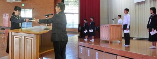 学習委員長に濱田翔馬君、副委員長に有田連君、書記に吉行華彩さん、生活委員長に山菅杏梨咲さん、副委員長に黒木希羽さん、書記に西川駿太郎君、文化委員長に福島唯加さん、副委員長に藤森楓さん、書記に日髙愛さん、保健委員長に山菅あみさん、副委員長に修行輝桜君、書記に西川真愛さんが任命されました。濱田君が代表して決意を表明しましたが、「任命され、重大な役割を担うことになり、緊張しています。その一方で『学校を(より良い方向に)変えたい。』と燃えています。」と頼もしい決意を述べてくれました。