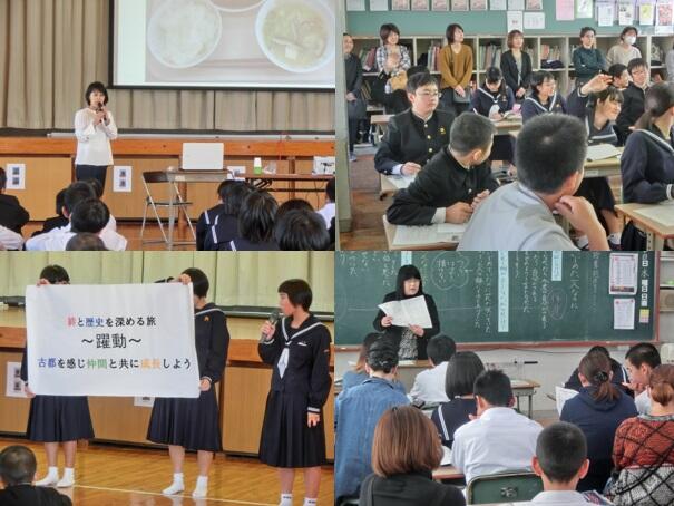道徳の授業は、どの学級も班活動や映像を活用して、生徒によく考えさせる内容になっていました。家庭でも授業を振り返って、親子で話をしていただければ幸いです。2年生は、12月2日から始まる修学旅行について、細かい所まで確認がありました。修学旅行のテーマは、「絆と歴史を深める旅~躍動~古都を感じ仲間とともに成長しよう」です。充実した旅となるよう準備をしっかりやっていきましょう。