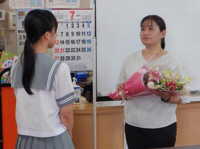 また、1学期末をもって、ご退職される職員への花束贈呈も行いました。新天地、アメリカでの活躍を職員・生徒一同、祈念しています。