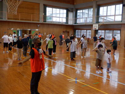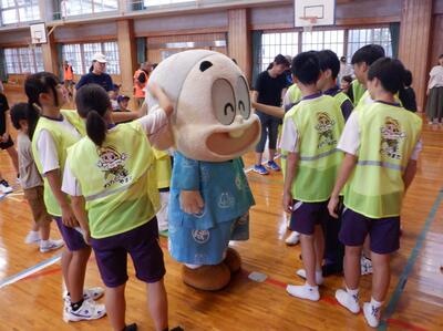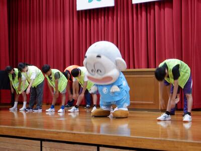 8月9日(土)、朝7時から、山田地区一斉ラジオ体操が開催されました。山田小、中霧島小、木之川内小の校区ごとに、子どもからご高齢の方々までが一緒になって、楽しく体を動かしました。また、中霧島小学校の会場には、ぼんち君がサプライズで参加し、会場を盛り上げてくれました。