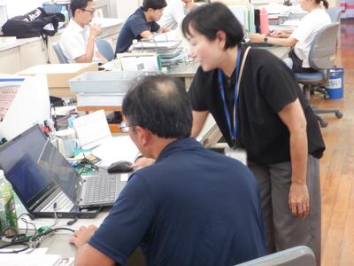 8月18日(月)、2学期に向けた準備として、ICT機器の効果的な活用を目指す職員研修を実施しました。今回は、ICT支援員に講師を依頼し、協働学習支援ツール「InterCLASS Advance」を用いて、発表者の画面を共有したり、学習者に教材を配布したりする方法について学びました。