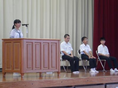 始業式では、各学年及び生徒会の代表が、2学期に向けての抱負を述べてくれました。2学期は、紫峰祭や合唱コンクール、駅伝ロードレース大会、修学旅行などの学校行事が目白押しですので、新たなリーダーが活躍してくれることを期待しています。