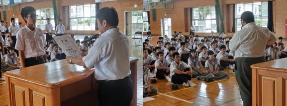 9月19日(水)、全校集会を開きました。内容は、表彰、校長先生の話、生徒指導主事の話でした。