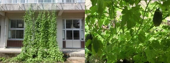 6月7日(木)、本校の第1棟と第2棟の間にある花壇にゴーヤの苗を植えました。都城市のグリーンカーテン大作戦の一環で、教育総務課よりゴーヤの苗15鉢が支給されたためです。写真は今の様子ですが、こんなに成長しました。