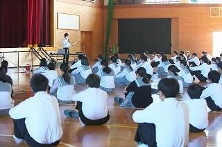 都城市の選挙管理委員会の皆様にお越しいただき、全校生徒を対象に、選挙の意義について考える授業を実施しました。
