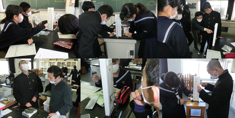 1月31日(金)、1年1組の生徒が理科の実験活動に取り組みました。この日の学習課題は、「フックの法則を利用して、身近な物の質量を測定しよう。」で、輪ゴムを使い、その伸びた長さから重さを測定しようという活動でした。