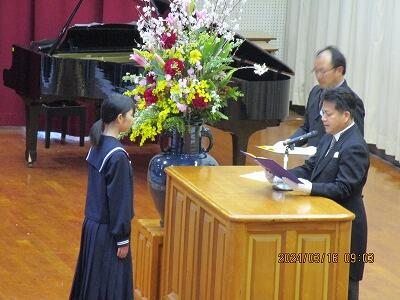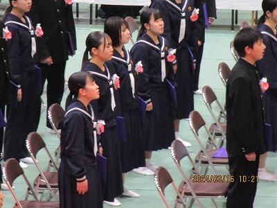 送辞では2年生の原田さんが、「先輩方は、いつも私たちの目標だった。これからは先輩方に負けないような良き手本となるよう頑張っていく。仲間と過ごしたかけがえのない日々を思い出し、力に変えて乗り越えていってほしい」と述べました。