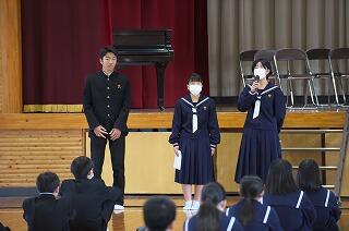 旧生徒会長の東さんは、「自分たちがやり残したことを後輩の皆さんに託したい。生徒全員が、生徒会活動に意識をもって取り組んでほしい」と述べました。また、新生徒会長の原田さんは、「これまでの役員の皆さんに感謝している。生徒の意見を大切にしながら活動していきたい」と述べました。