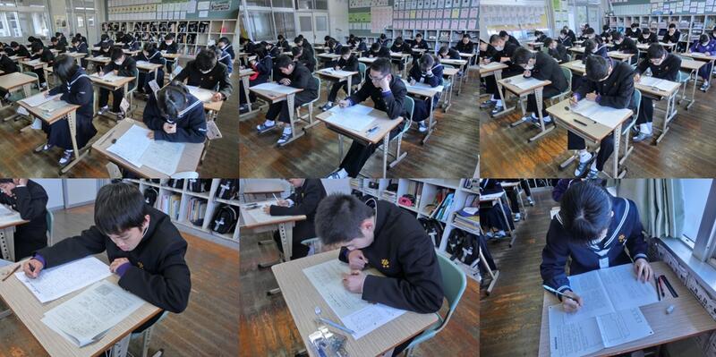 2月17日(月)、全学年一斉に学年末テストが始まりました。実施教科は、どの学年も国語、社会、数学、理科、英語の5教科で、この日は3教科、明日18日(火)は2教科が実施されます。