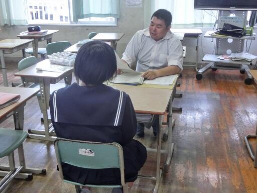 事前にアンケート調査を実施し、これに基づいて全員を対象に相談を実施します。学習のこと、自分の性格、部活動、進路など生徒の悩みやその深刻度はそれぞれです。3年生は、進路決定を間近に控え、受験先についての相談が中心だったようです。学級担任が相談相手となりますが、話すだけでも楽にはなるものです。それが解決すれば、言うことはありません。解決には、本人の努力、家の方、クラスメイトや学校職員の支えが必要です。