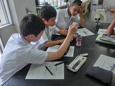 6月19日(火)、3年2組の理科の授業をのぞいてみると、実験をしていました。授業のテーマは、「酸とアルカリの水溶液を混ぜるとどうなるか。」で、水酸化ナトリウムに塩酸を混ぜて化学反応の様子を観察し、考察結果をまとめるという授業でした。