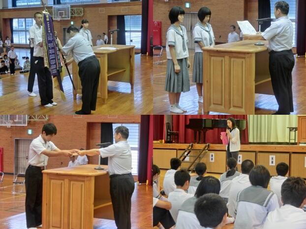 表彰については、先日行われた都城地区中学校総合体育大会で優勝の野球部、準優勝の女子バレー部の優勝旗や賞状を校納してもらいました。2つの部は山田中学校の代表から地区の代表になります。県大会でも中学生らしい、一生懸命なプレーを期待したいと思います。バレー部はその他、霧島山麓中学生バレーボール選手権大会3位の成績を修めており、併せて校納しました。また、保体の時間に実施された文部科学省実施要項による新体力テストでも優秀な成績を修めた生徒も多く、全校生徒の前で表彰されました。