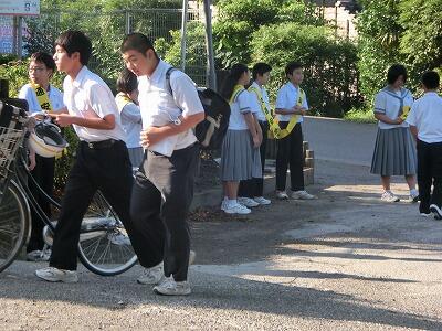 各学級から3名ずつの10の班を編制し、校門付近と県道から学校への入り口付近で、朝7時30分から7時45分まで、登校してくる生徒へあいさつをしています。県道から学校への入り口付近に立つ生徒は、生徒ばかりではなく、目の前を通る車にも大きなあいさつをしています。生徒ばかりではなく、車の中からもあいさつが返ってきて、とてもすがすがしい朝を迎えています。