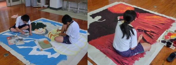 何をモデルとしているのか、「まだ公表しないで欲しい。」ということなので、ここでは伏せていきます。下絵が終わり、作業は全体の1/4~1/3といったところでしょうか・・・。作業に携わっている生徒の皆さん、暑い中ご苦労様です。素晴らしい作品になるよう期待しています。
