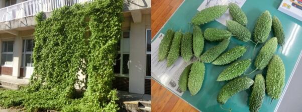 都城市のグリーンカーテン大作戦の一環で、教育総務課よりゴーヤの苗15鉢が支給され、6月から育てていますが、予想以上に成長し、実の処理に追われています。
