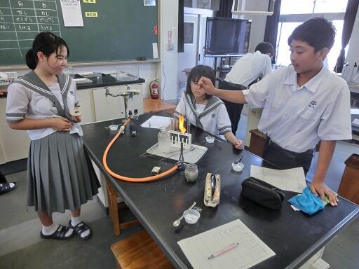 8月31日(金)、1年生が理科の授業で実験に取り組みました。ただでさえ暑いのに、ガスバーナーまで使用しての大変暑い中での実験でした。生徒は汗をかきながら、謎の物質Xの正体を突きとめようと頑張っていました。