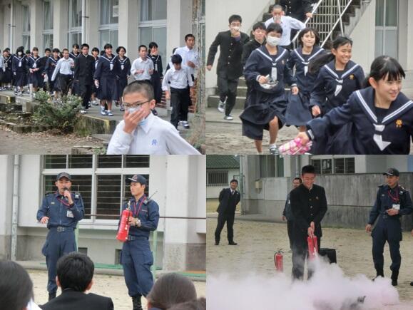 11月21日(水)、火災を想定した避難訓練を実施しました。都城市北消防署や消火器等を取り扱っているエースサービスの方々にも来校していただき、避難の仕方や消火器の取扱について指導していただきました。