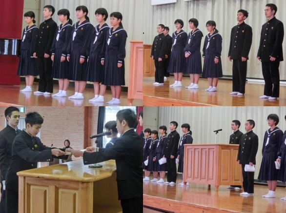 学習委員長に濱田翔馬君、副委員長に有田連君、書記に吉行華彩さん、生活委員長に山菅杏梨咲さん、副委員長に黒木希羽さん、書記に西川駿太郎君、文化委員長に福島唯加さん、副委員長に藤森楓さん、書記に日髙愛さん、保健委員長に山菅あみさん、副委員長に修行輝桜君、書記に西川真愛さんが任命されました。濱田君が代表して決意を表明しましたが、「任命され、重大な役割を担うことになり、緊張しています。その一方で『学校を(より良い方向に)変えたい。』と燃えています。」と頼もしい決意を述べてくれました。