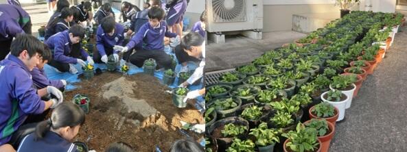 パンジー(黄、青、ローズ)とスミレを合わせて369株植えました。この花は見て楽しむこともできますが、卒業式や入学式の会場を飾ることになります。これから苗が育ち、花がきれいに咲くまでには、水をやったり、萎びた花を摘んだりする手入れが必要です。このような活動をとおして、生徒は命の大切さや思いやりの心について考えることになると思います。