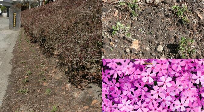 2月17日(日)、地域の岩邉さんご夫婦、お二人の朝倉さん、別府さんが山田中学校のために芝桜の苗をたくさん植えてくださいました。管理棟玄関前と校門付近です。学校の環境整備のためにボランティアで作業していただきました。ありがとうございました。