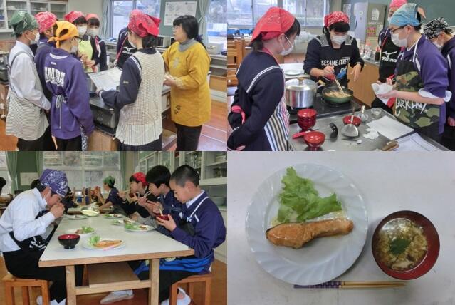 2月22日(金)、1年2組が調理実習に取り組みました。先週の1組と同様に、鮭のムニエルとかき玉汁の2品を作りました。