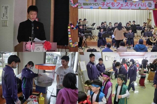 2月24日(日)、山田地区社会福祉協議会主催による、福祉のつどい「子どもフェスティバル」が山田総合福祉センター(けねじゅ苑)で開催されました。本校からは、17名の3年生と吹奏楽部がボランティアで参加しました。