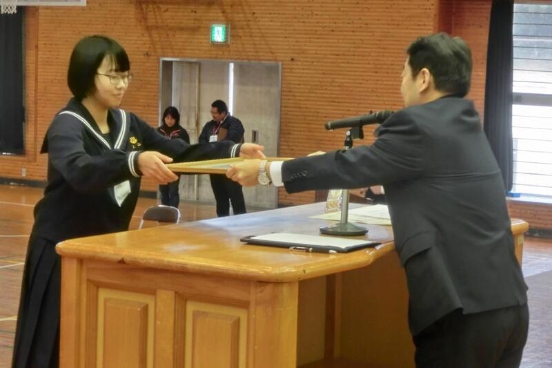 今回も多くの表彰がありました。都北地区こども造形展、みやこんじょボランティアフェスティバル、宮日ジュニア展、都三書き初め展、山田地区社会福祉協議会・ボランティア連絡協議会、都城市教育委員会奨励賞といった文化面での表彰の他、女子バスケット部が大会で3位となった表彰もありました。これからも多方面での生徒の活躍を期待したいと思います。