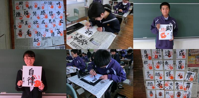 2年生は、2月12日(水)に挙行予定の立志式へ向けて着々と準備を進めています。1月23日(木)の5、6校時の総合的な学習の時間に、自分の夢、希望、目標、決意を漢字1文字または2文字に込め、毛筆で色紙に表現しました。