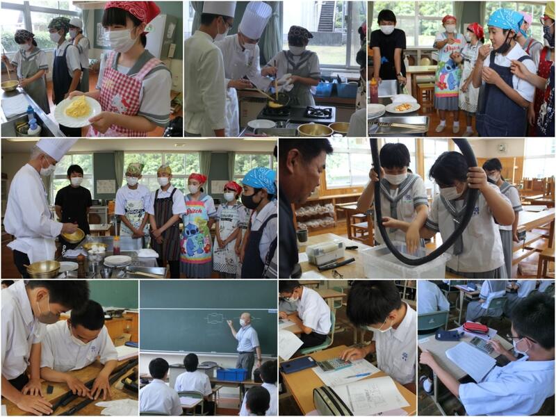 7月2日(木)、2年生の総合的な学習の時間では、職業体験学習ということで日章学園から先生を招き、様々な体験をさせていただきました。本来、職場体験学習では各事業所に出向き、様々な仕事を体験するものですが、新型コロナウィルスの感染予防のため実施できませんでした。しかし少しでも生徒に職業観を養い、自分の将来を考えるための1つのきっかけになればと思い、このような形で実施しました。オムレツの作り方を学ぶコース、電気に関すること、電卓を使った演習、パンクを見つける活動。生徒達の興味も非常に高くとても意欲的に活動していました。オムレツは調理の先生が実際に教えてくださり本場のふわとろオムレツを作ることができました。電気のコースでは静電気のしくみを理解し、なぜスマホがタッチできるかを理解することができました。各コースでとても楽しい演習が行われ、大変充実した学習ができました。少しずつ自分の進路について考え、仕事や職種について学んでいきましょう。
