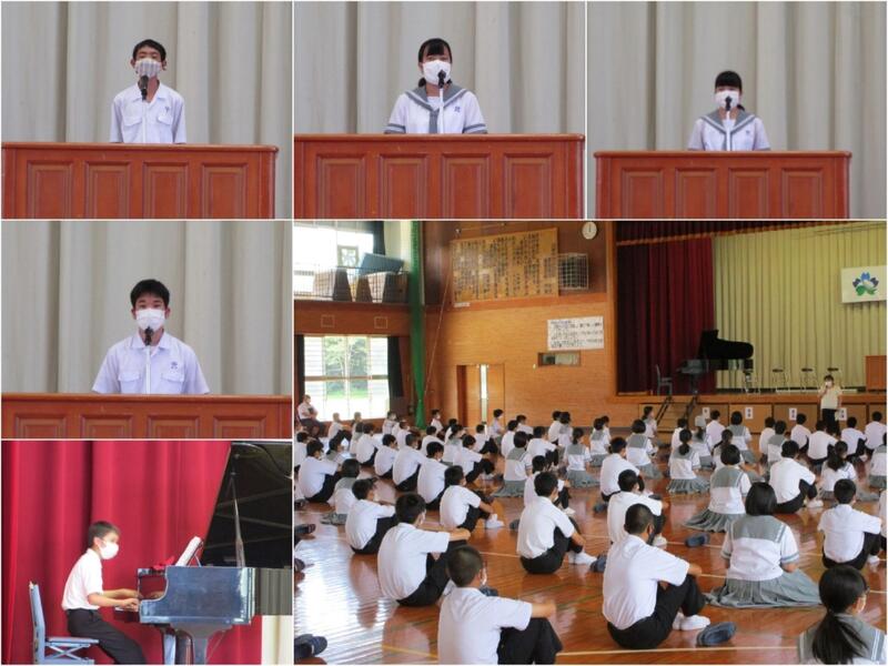 終業式では1学期の反省を1年生の東馳緯さん、2年生の吉田こころさん、3年生の徳満天優さん、生徒会を代表して若松黎さんの4名が代表で発表しました。4人ともそれぞれの立場で、1学期の反省や、2学期へ向けて豊富など前向きでとても立派な発表でした。