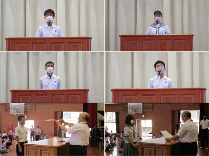 8月24日(月)、2学期がスタートしました。始業式では、1年生の東涼音さん、2年生の畑中世純さん、3年生の中島耕太朗さん、生徒会の南海稀さんが代表して2学期の抱負を述べてくれました。どの発表も前向きな気持ちが伝わる素晴らしい発表でした。2学期は1番長い学期であるとともに、体育大会や紫峰祭などの行事もあり、とても忙しい学期です。コロナ禍で今までとは違うこともあると思いますが、学校行事に積極的に取り組んでください。またそれぞれの発表の中に学習面についての話もありました。忘れ物が多いと述べてくれた生徒もいましたが、デイリーライフにきちんと記入する、課題は後回しにせず、先に終わらせるようにする、準備は前の日の夜のうちに済ませておくなど、しっかり改善してほしいです。本校の課題は学力向上です。部活や行事に忙しいですが、しっかりと両立して頑張ってください。