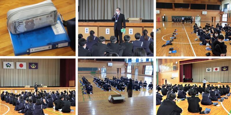 防災学習は、社会福祉協議会の方にお世話いただき、防災都城のみなさんに来校いただきました。南海トラフ地震が起こったら…。スライドを使いながらお話をうかがったり、負傷した方を救助するための処置の仕方を実習したり、火災に遭ったときを想定してスモーク室を体験したり、とても勉強になる内容でした。体験した生徒の一人は、「ダンゴムシのポーズで冷静になれると聞いて勉強になりました」と、感想を話してくれました。※写真2・3段目