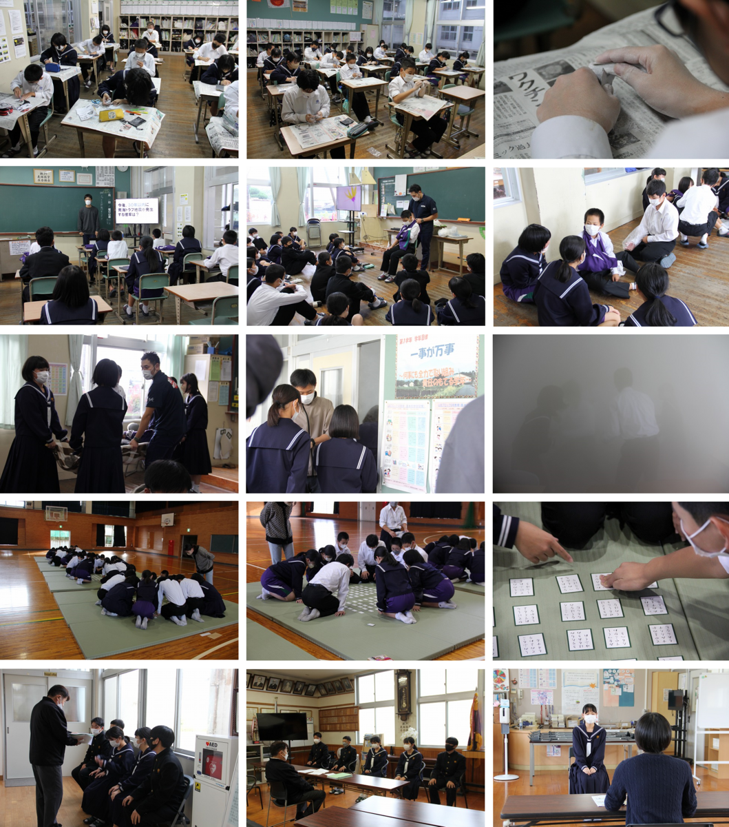 百人一首大会は、真剣に手札を見つめ、とても盛り上がっていました。国語の授業で学習した歌が出てくるたび、生徒の手が手札に伸びて、一緒に参加した先生チームも1回戦で敗れるほどでした。※写真4段目