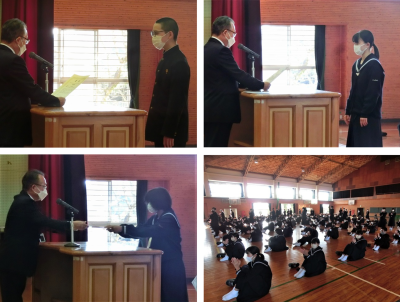 その次は終業式。式の初めは「2学期の反省」。1年の萬壽駿斗さん、2年の吉田ひよりさん、3年の久保田穂乃香さん、生徒会の下村羽美さんの4人が、学年や生徒会を代表して発表してくれました。それぞれが、2学期に取り組んだ行事や学習についての振り返りを述べるとともに、その中で明らかになった課題点をあげてくれました。