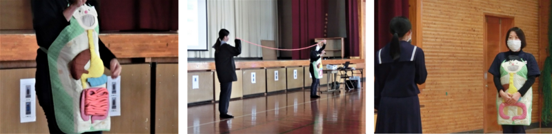 ロードレースを終えた後は、保護者と一緒に体育館で学校保健委員会も開催しました。都城ヤクルト販売(株)から栄養士さんを講師にお迎えし、「カラダの健康とプロバイオティクス」と題してご講演いただきました。身に付けたエプロンのマーちゃんを使って実物大で腸の長さを見せていただきながら、最近よく耳にするプロバイオティクスについて知ることができました。