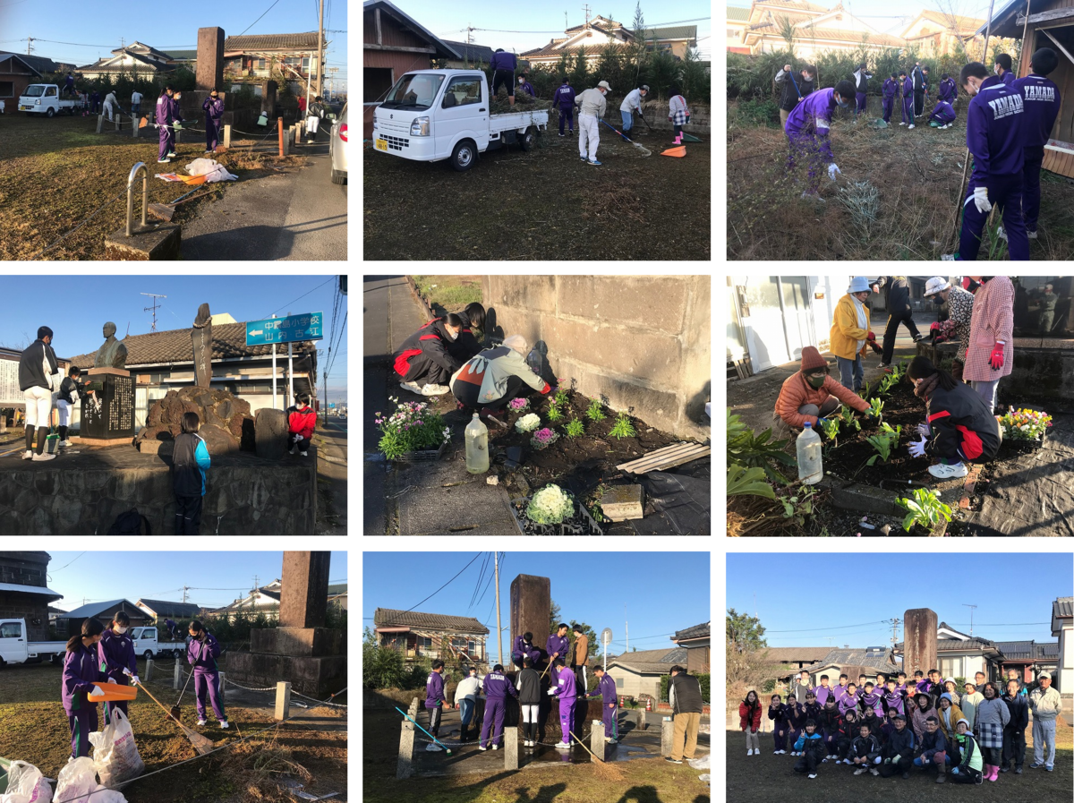 12月10日(土)、天気は晴れ。雨のために延期となっていた「島移りの碑」周辺(谷頭駅近く)の清掃ボランティアを行いました。早朝8時からの作業にもかかわらず、22名の生徒だけでなく、山田地区まちづくり協議会、山田のかかし笑劇団、山田地区社会福祉協議会、地域生活課や学校教育課のみなさんもお手伝いに駆けつけてくださいました。