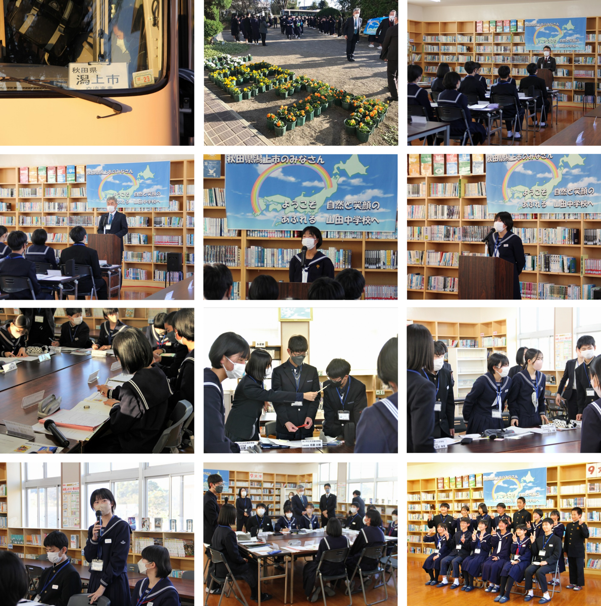 秋田からの2年生には、まず体育館で山田中2年生の総合的な学習の発表を見ていただきました。その後は、学級に戻って一緒に授業に参加していただきました。※写真3段目