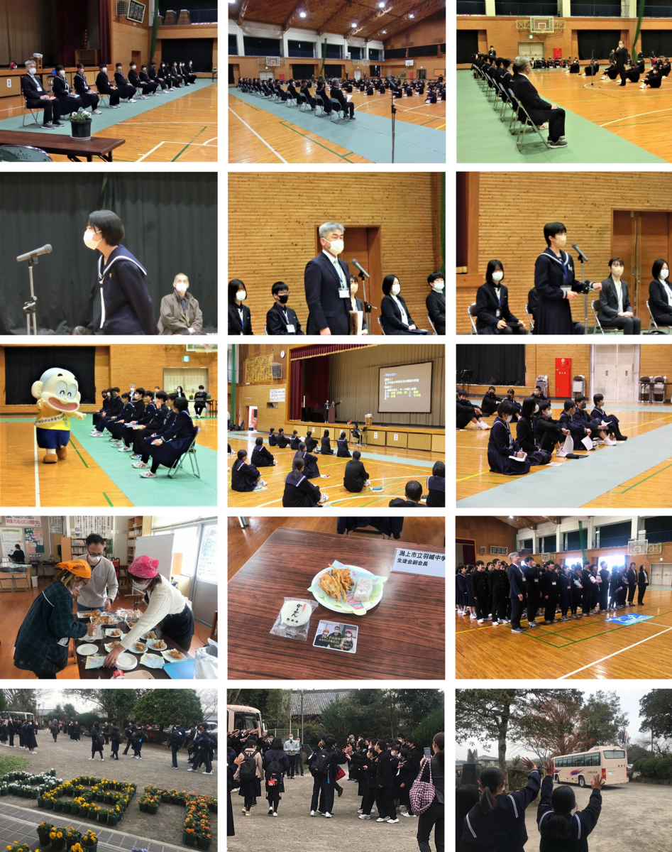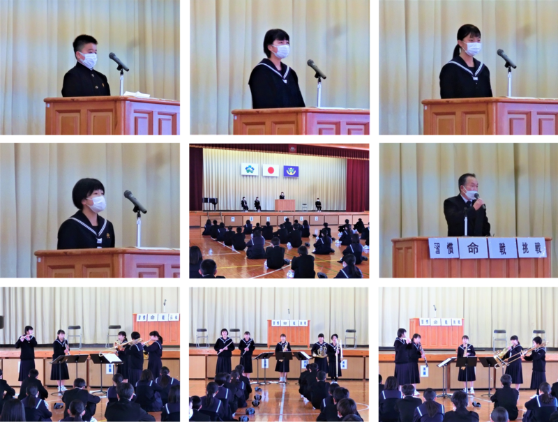12月16日(金)、今日は朝から潟上市のみなさんとの交流でした。まずは、全校生徒との歓迎会。体育館に一同が集まり、入場から吹奏楽部が演奏を担当し、歓迎演奏も聴いていただきました。最初に山田中学校の校長先生と生徒会長から歓迎のことばが贈られました。その後、羽城中学校の校長先生と生徒会長の加賀谷碧来さんからごあいさつをいただきました。※写真1、2段目