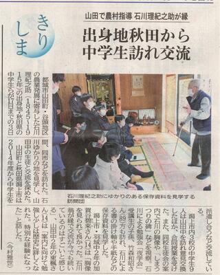 山田町に縁のある石川理紀之助翁。本校は、翁の出身地である秋田県潟上市の中学校と学校間交流を続けています。今年度は、秋田県潟上市立天王中学校、天王南中学校、羽城中学校の各学校から生徒会の会長、副会長のみなさんが来校してくださいました。