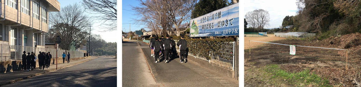 部活動開始前、正門付近に目線を向けると、植え込みに人影が見えます。正門の外に出てみると、女子バレーボール部の生徒たちが、登校した順に竹箒を持って落ち葉を集めていました。おかげで、正門周辺と学校の前の歩道が正月準備をした時と同じぐらいきれいになっていました。初練習よりも前に、学校をきれいにしてくれてありがとう。※写真中・右