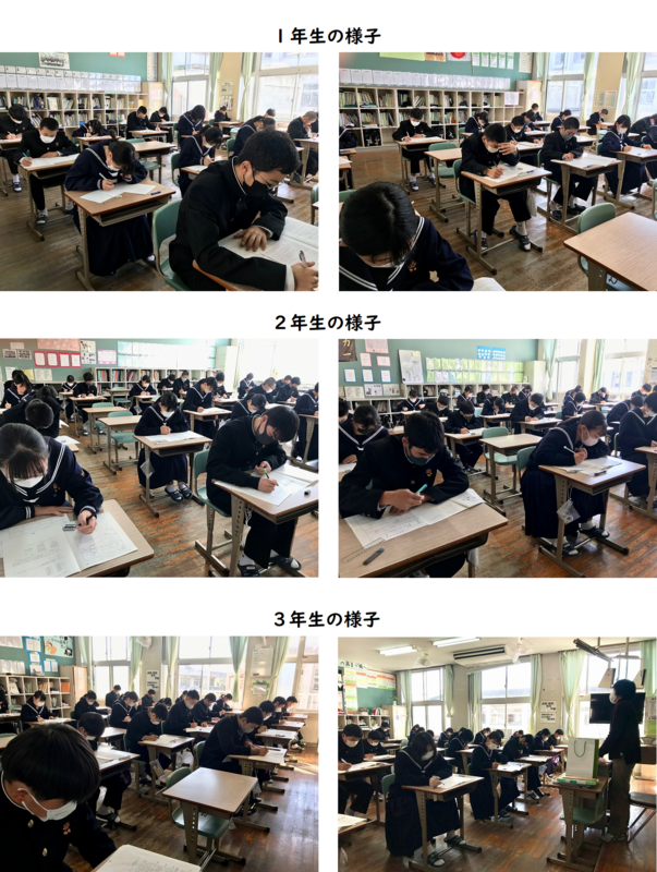 1月13日(金)、3学期が始まって4日が経ちました。昨日と今日の2日間で、1、2年生は都北地区学力診断テスト、3年生は実力テストに挑戦しました。