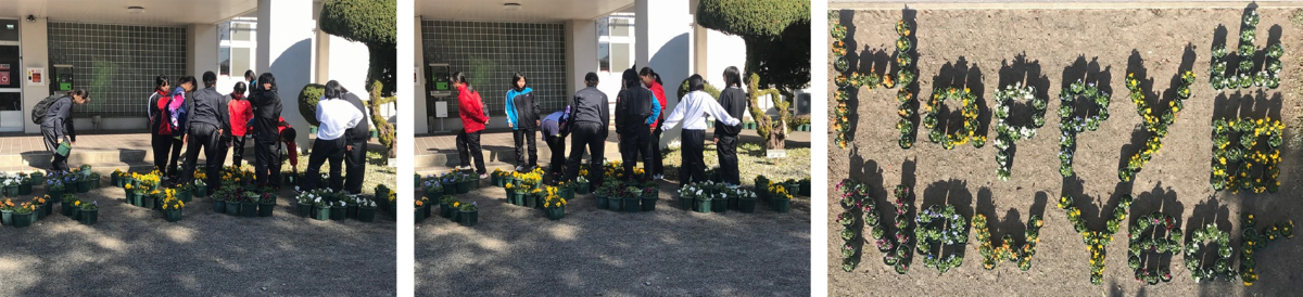 潟上市の訪問に合わせて、玄関前に並べたパンジーの鉢植えで「WELCOME 山田中」と花文字を作り、そのまま年を越しました。初練習を終えた女子ソフトテニス部が、花文字をリニューアルしてくれました。