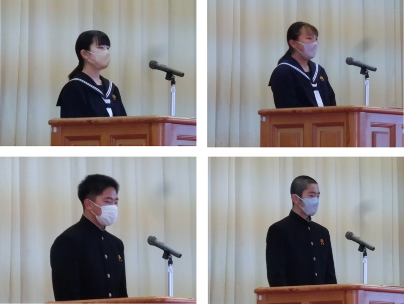 生徒会代表の福岡 翔さんは、①12月から実際の出番となった新生徒会は、秋田の交流事業という大きな行事を経験し、計画の大切さなど、引継ぎで聞いたことを実感した ②よりよい学校づくりに努めたい ③全校生徒が自分の生活態度を振り返り、充実した学校生活にしよう! と、新生徒会としての抱負とともに、全校生徒に向けて呼びかけまでしてくれました。※写真右下