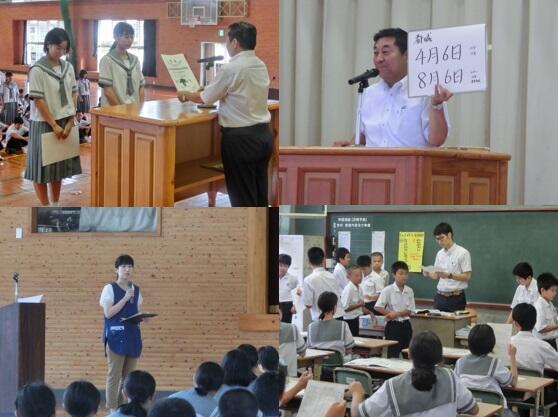 全校集会では、先日行われた県中学校総合体育大会で3位入賞の女子バレー部、県吹奏楽コンクールで銅賞の吹奏楽部の表彰がありました。その他、校長先生の話、各担当職員からの連絡がありましたが、校長先生は原爆投下や終戦の記念日が近づいていることもあり、平和について話しました。8月6日、9日、15日は記念日で、全国的に様々な祈念式典が催されます。4月6日、8月6日は都城にとって大切な日ということがわかりました。前者は都城から特攻隊が出撃した日、広島で原爆が投下された後者は都城が大空襲を受けた日です。平和の尊さについて考える貴重な機会となりました。