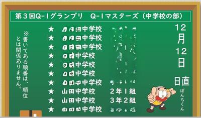 12月1日(月)、全学年一斉に挑戦しました第3回Q-1グランプリの結果が出ました。今回、市内の中学校の全クラスにおける、上位10学級(Q-1マスターズ)に、山田中から2クラス(2-1、3-2)が入りました。毎日の積み重ねが成果として形に表れる結果となり、大変嬉しく思います。