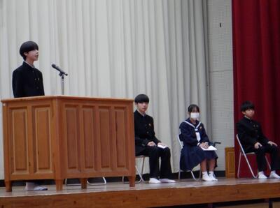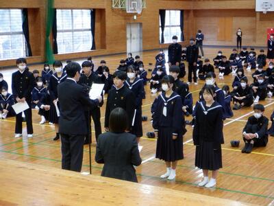 12月24日(水)、体育館で2学期終業式を実施しました。各学年及び生徒会代表による2学期の振り返りや各種表彰が行われ、2025年の1年間を締めくくりました。明日からの冬季休業中に、心身をリフレッシュし、新たな決意で新年(3学期)を迎えてくれることを期待しています。