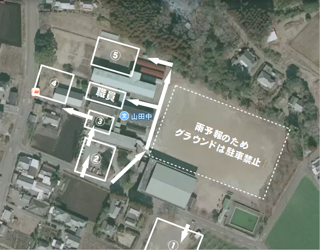 天気予報によりますと当日は晴れのようですが、駐車場としてグラウンドは開放しません。つきましては、駐車場を下記の通り指定いたします。駐車場には限りがあります。また、敷地内は通行する保護者や生徒がおりますので、事故のないようにご注意ください。