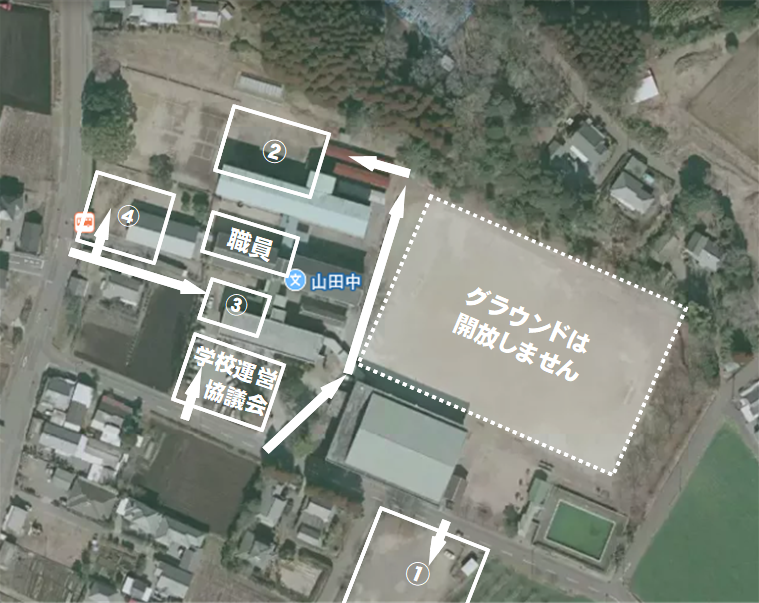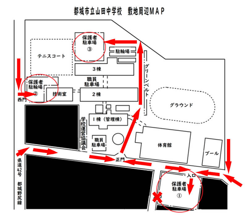 1 保護者駐車場⇒ ①体育館横駐車場 ②・③敷地内駐車場