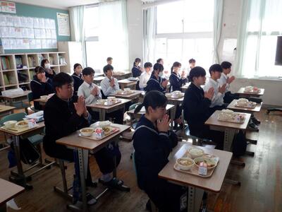 12月12日(金)の学校給食は、山田中3年1組のリクエストメニューでした。校内ロードレース・駅伝大会を終えて、いつも以上にお腹をすかせた生徒たちは、調理員の皆さんに心から感謝しながら、とても美味しくいただきました。